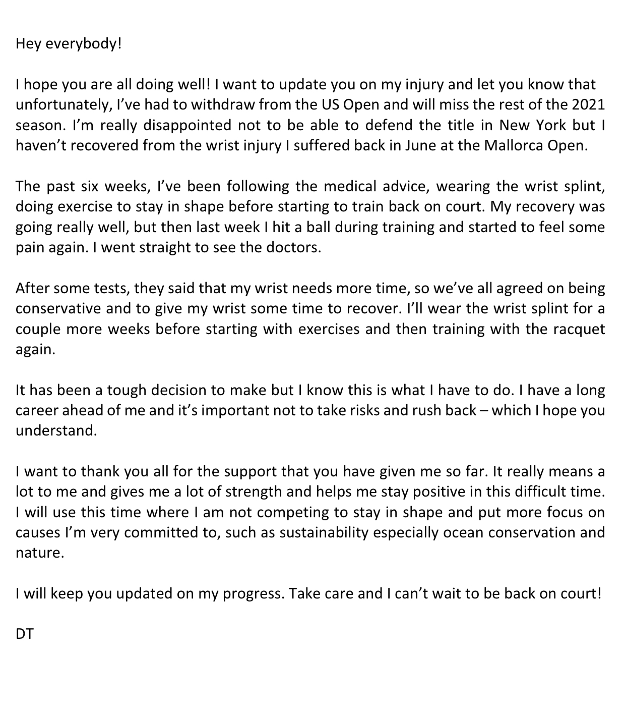 geçen senenin şampiyonu olarak geleceği 2021 amerika açık tenis turnuvası'ndan el bileği sakatlığı sebebiyle çekildiğini ve sezonun kalanını kaçıracağını belirten oyuncudur.
